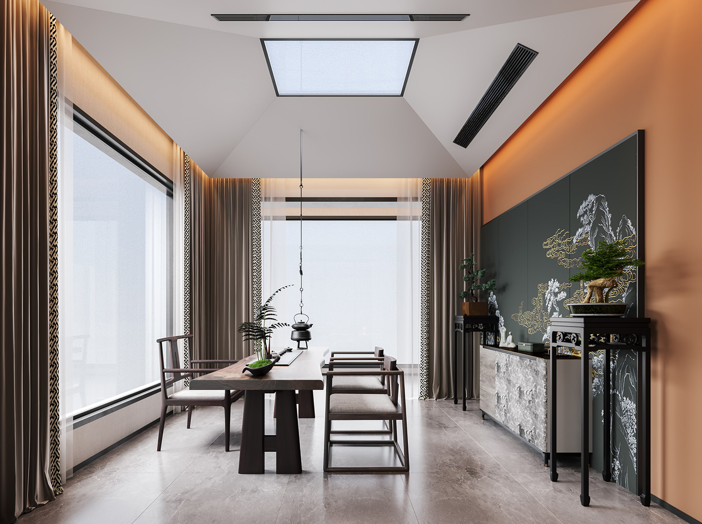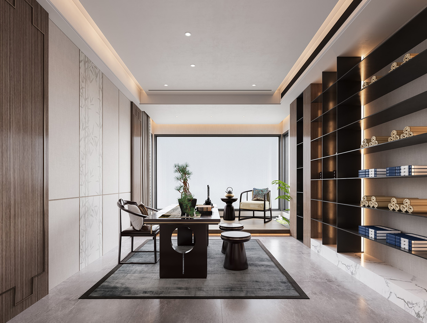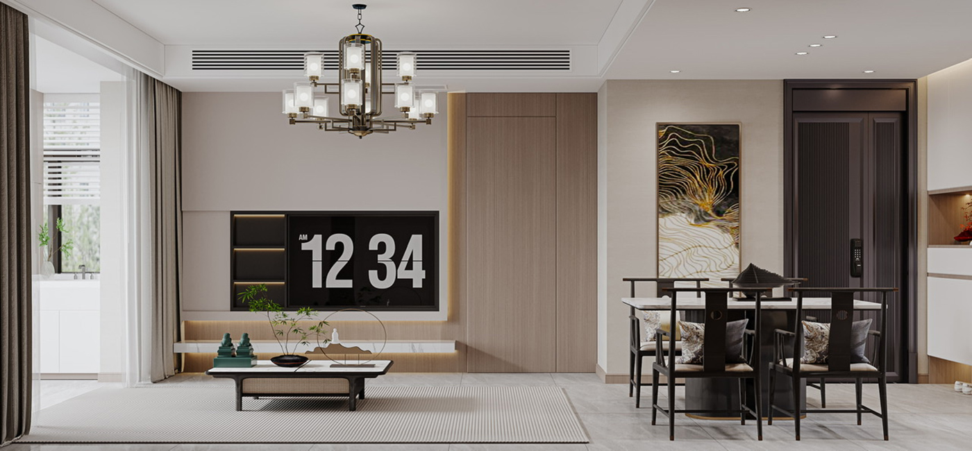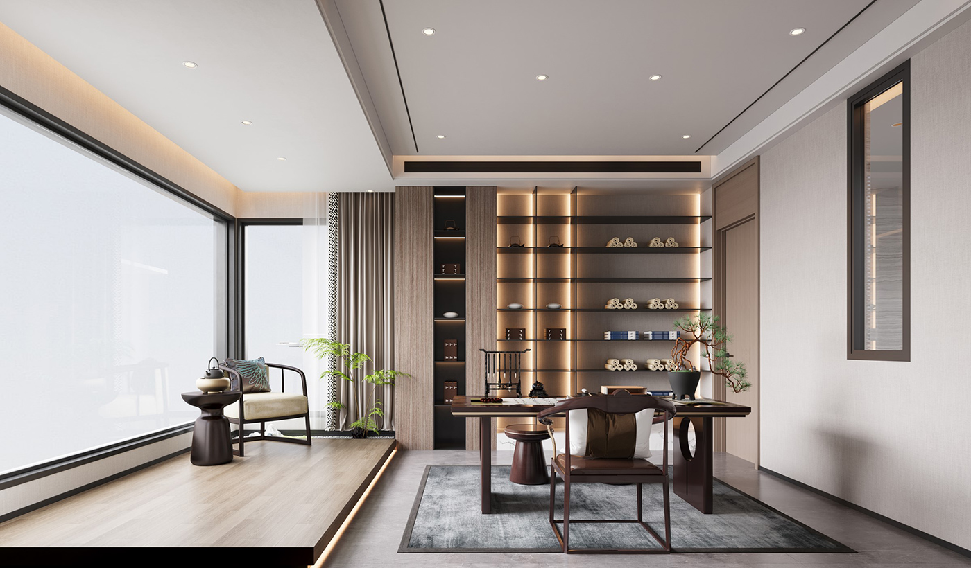 木纹材质与山水画等设计元素通过现代的手法和形式进行处理,配合新型材质与灯光的打造,营造山水之间,心之所往的静谧空间。 金属元素与艺术感岩板搭配,材质对比,让整个空间眼前一亮。
