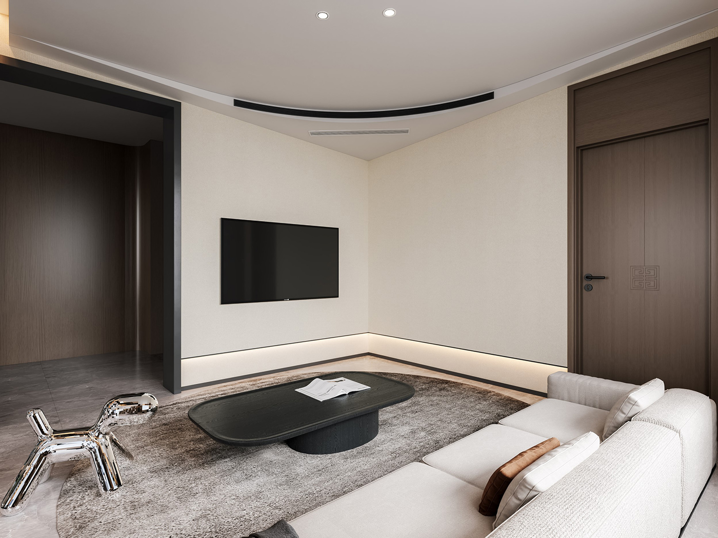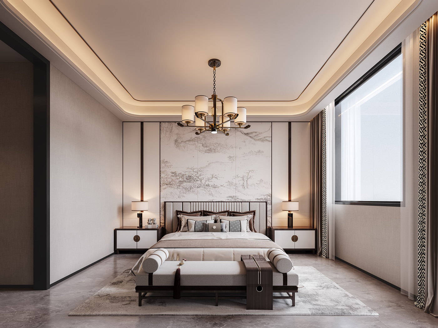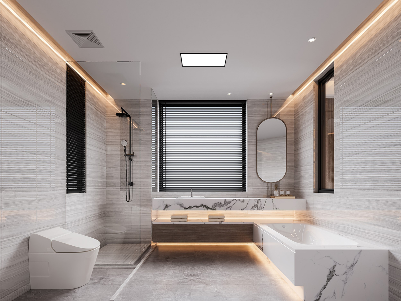木纹材质与山水画等设计元素通过现代的手法和形式进行处理,配合新型材质与灯光的打造,营造山水之间,心之所往的静谧空间。 金属元素与艺术感岩板搭配,材质对比,让整个空间眼前一亮。