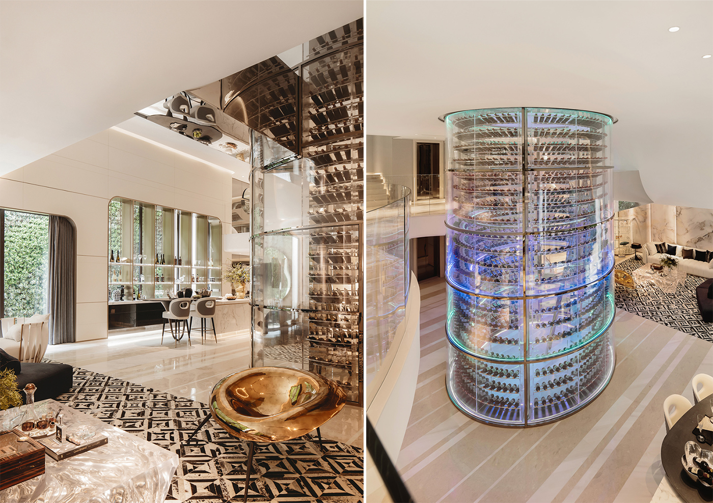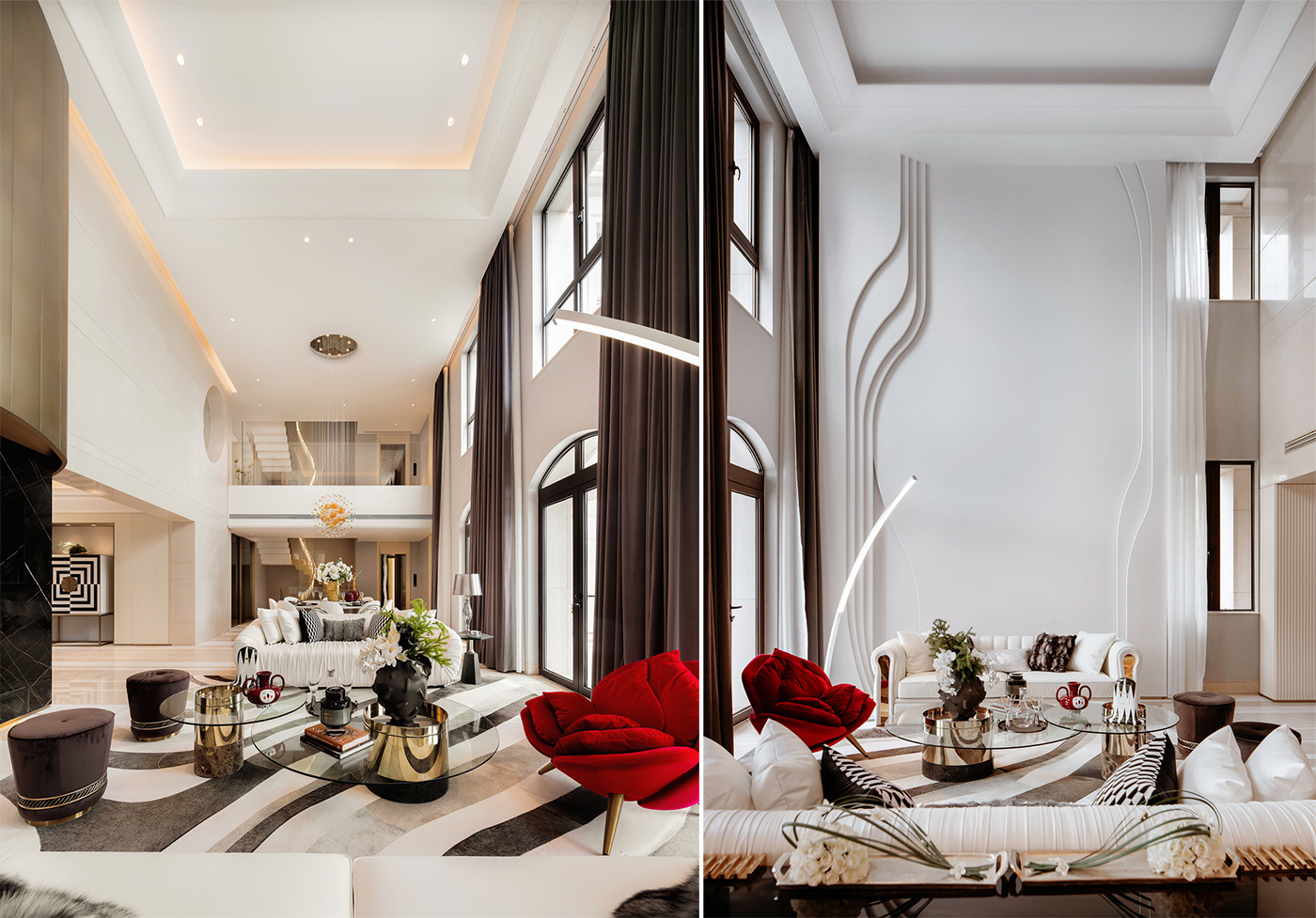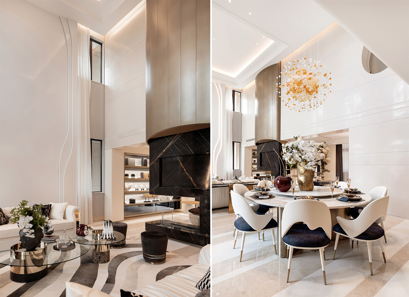 金螳螂·品宅携手台湾设计界领军人物邱德光将生活形态和美学意识转化为尊贵身份,赋予新奢华生活新内涵。以精益求精的工艺、匠心品质塑造卓越的体验感。艺术的使命不是模仿自然,而是表现自然。一体化客餐厅经由超高挑的层高被赋予足够的呼吸感和流动感。璀璨明月化作那直流而下的灯具点缀于餐桌之上,搭配精致的器物营造出浪漫的气氛。拒绝常规,纵跨空间高度的光电酒窖打造了一场光影变幻的视觉盛宴。