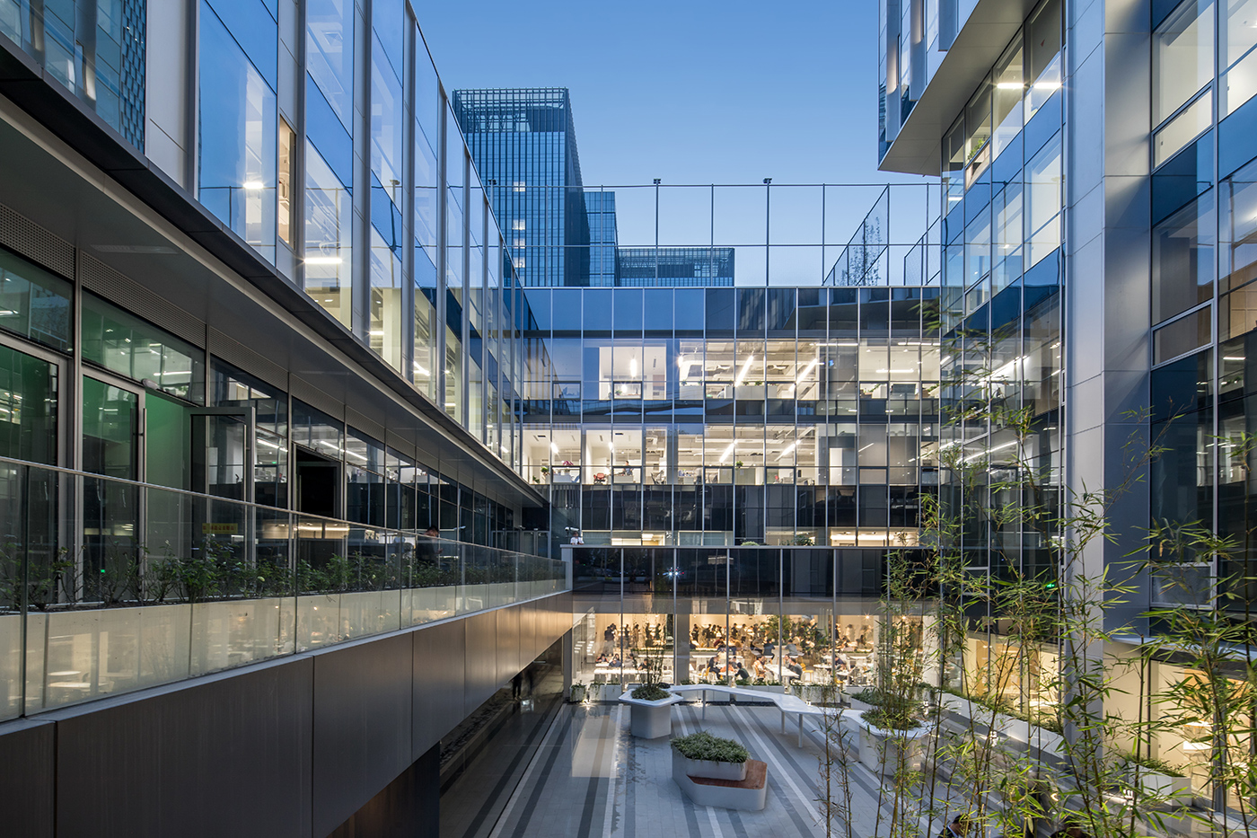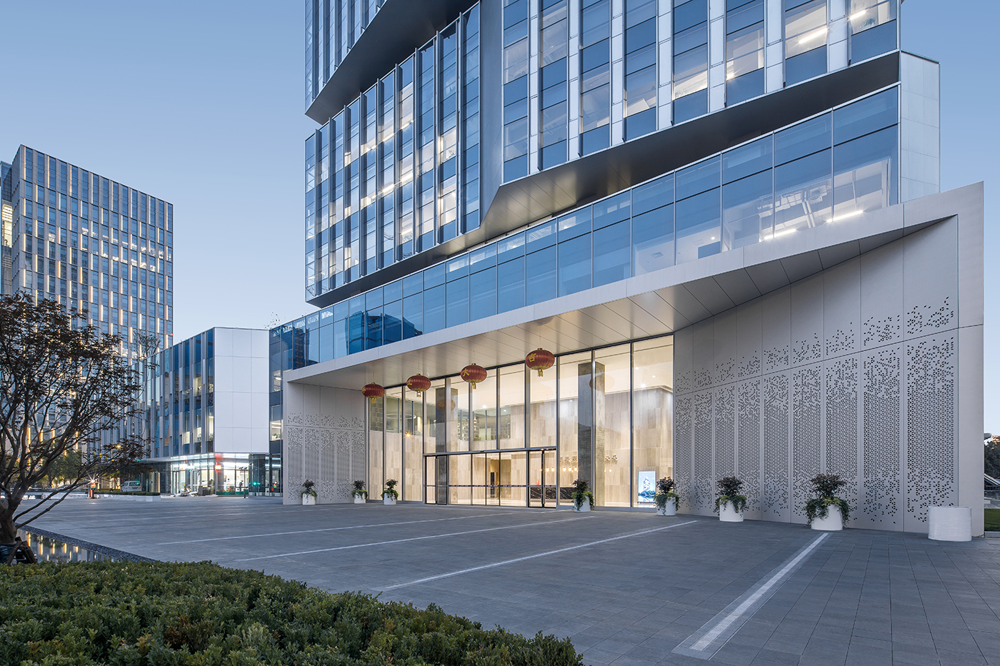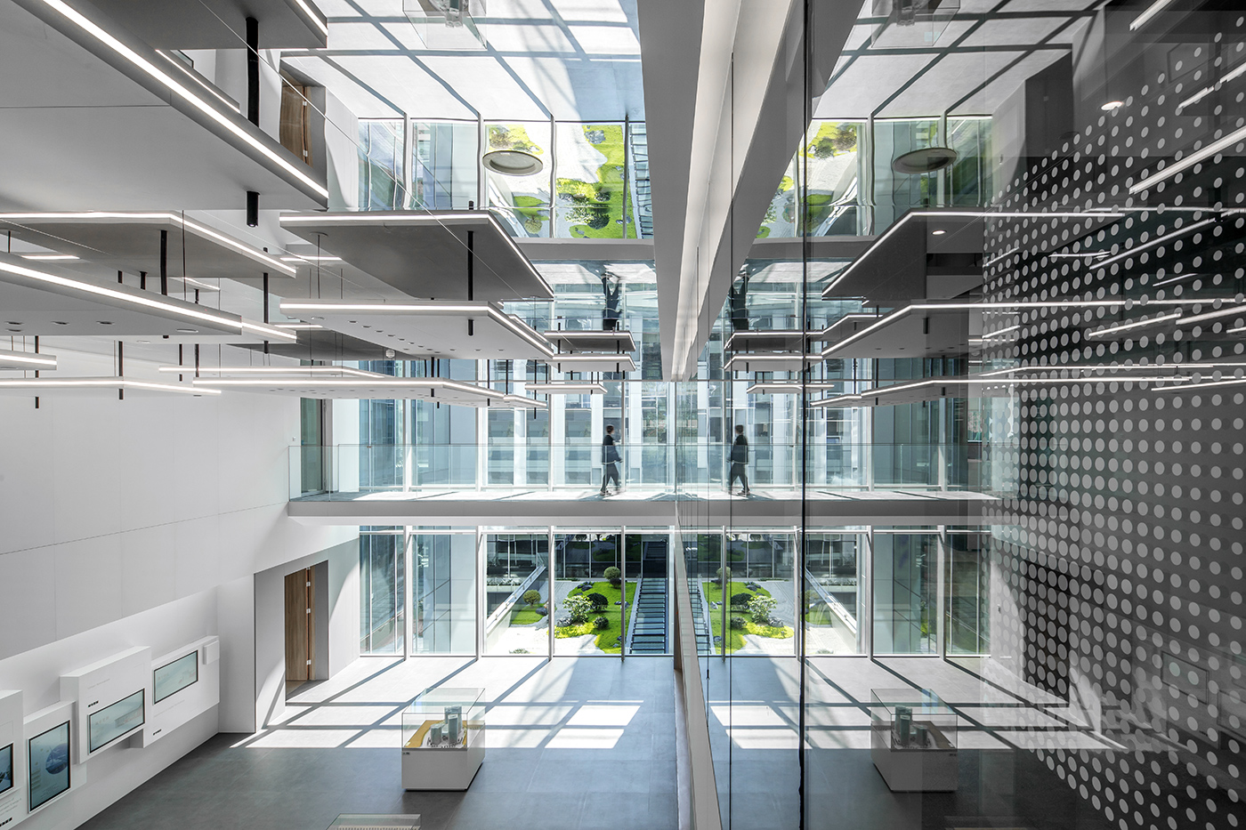 大厦不仅仅是一座办公楼,更是一座承载着历史与文化的艺术殿堂。每一个幕墙板块都像一件艺术品,流畅的线条、斑斓的色彩,犹如水墨画中的笔触,为这座建筑赋予了典雅而高贵的灵魂。大厦塔楼每四层创造一个垂直院落,仿佛是苏州民居中一进进的院落在垂直方向上的现代演绎;每四层一圈外廊形成空中环廊,宛如苏州园林中的“廊”,将人与自然完美融合。垂直院落与空中环廊共同构成观景最美中轴线,让人在城市的繁华中领略到苏州园林的绝佳视角。下沉庭院及光导管的空间布局,使得办公区域采光系数得到提升,有效改善了室内自然采光条件。南北双庭院和裙房屋面光导管及天窗的构思,更是在满足功能需求的同时,将苏州传统园林的美学发挥得淋漓尽致。