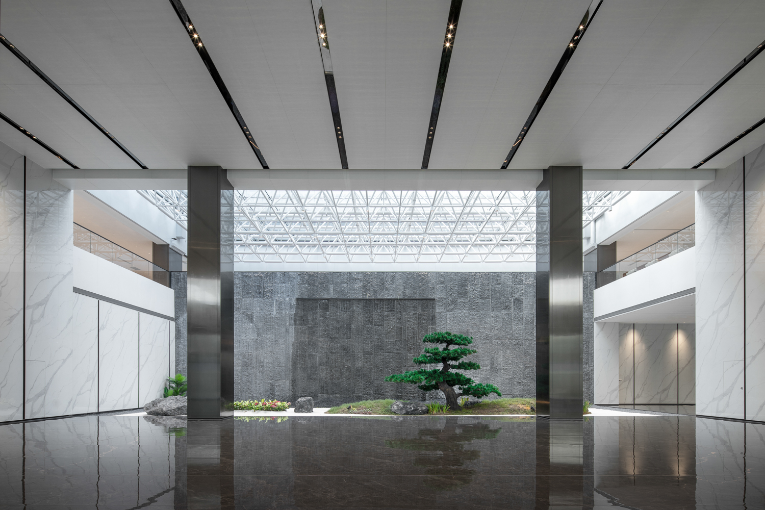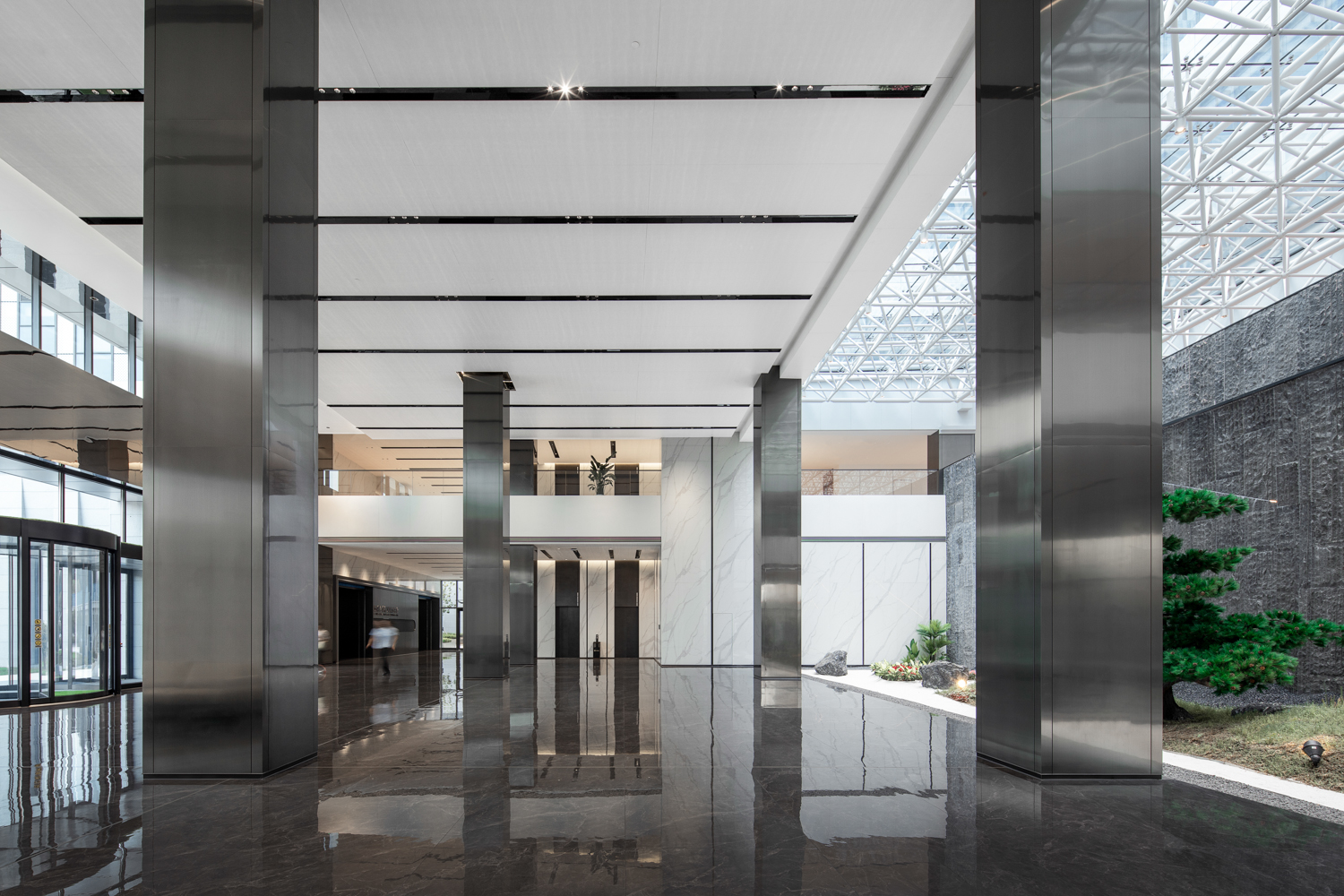 更新后的实验楼与研发楼连成一体,两栋楼交叉形成了公共的垂直交通核心,建筑“双回廊” 的设计正呼应了元利集团的品牌标志。