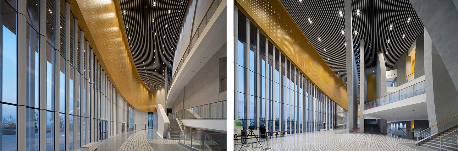 苏州湾文化中心由法国首位获得普利兹克建筑奖的设计师克里斯蒂安·德·包赞巴克先生设计,是全国首个将大剧院、影院、博物馆、会展中心等场馆和功能融入一体的城市文化综合体,总建筑面积21.5万平方米。其中,苏州大剧院是全国第三大剧院,金螳螂五分公司承接了苏州大剧院的弧形大厅、走廊及所有公共区域的装饰工程。