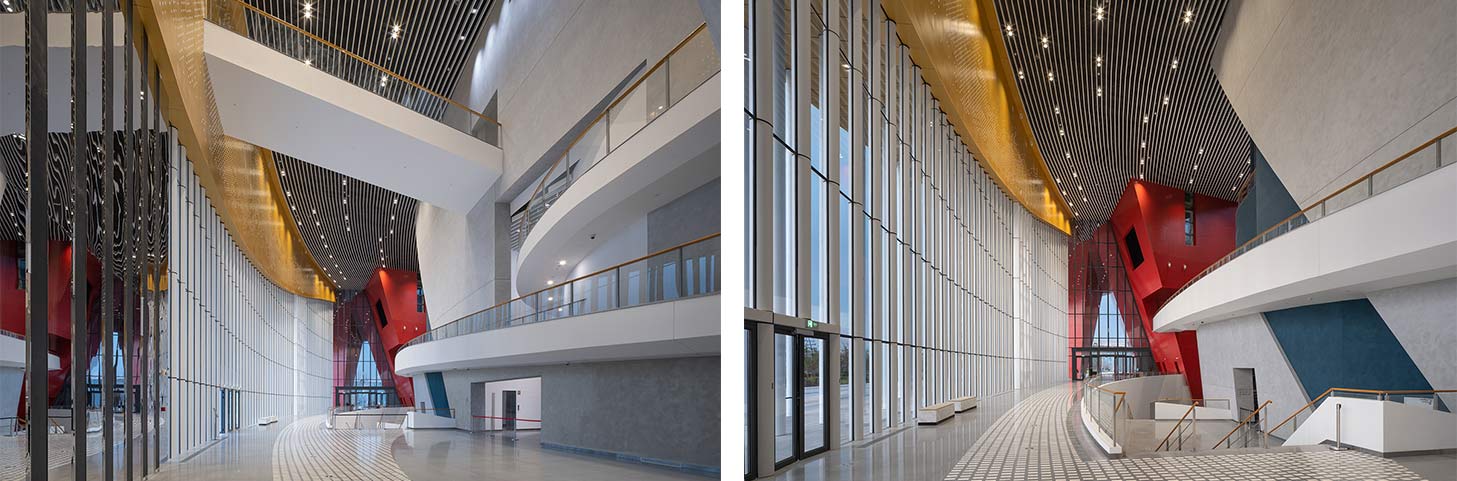 弧形大厅是苏州大剧院最核心的部位,步入大厅,首先被眼前的空间设计吸引,挑高22米的长廊、高大别致的异形曲面、婉转流畅的线条、简约明亮的色彩,营造出优雅与创新的现代浪漫建筑气息。大厅整体呈弧形,无论从哪个角度看,都是浑圆柔美、令人惊艳,然而大面积的异形曲面造型却给项目施工带来巨大挑战。