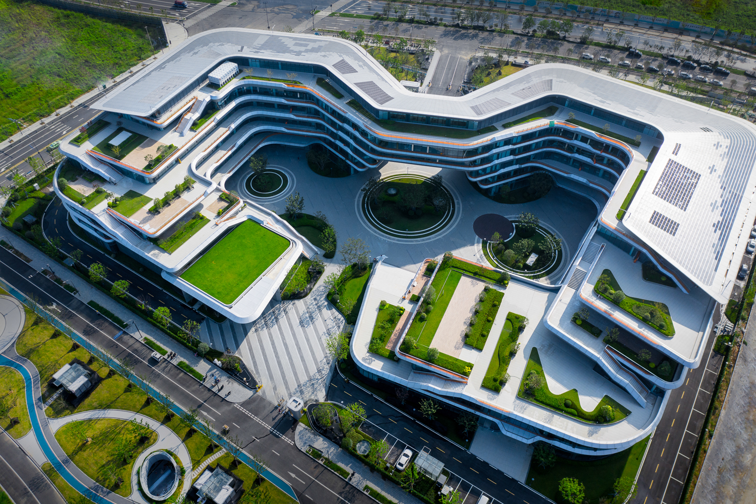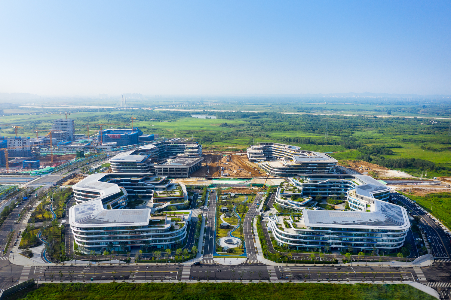 园区由6个建筑主体组成,展现出“如意和谐、聆听未来、探索未知”的设计概念。四栋研发办公主楼形如对称的“耳朵”,寓意“聆听未来”,分别为“A1楼、A2楼、A3楼和A4楼”。