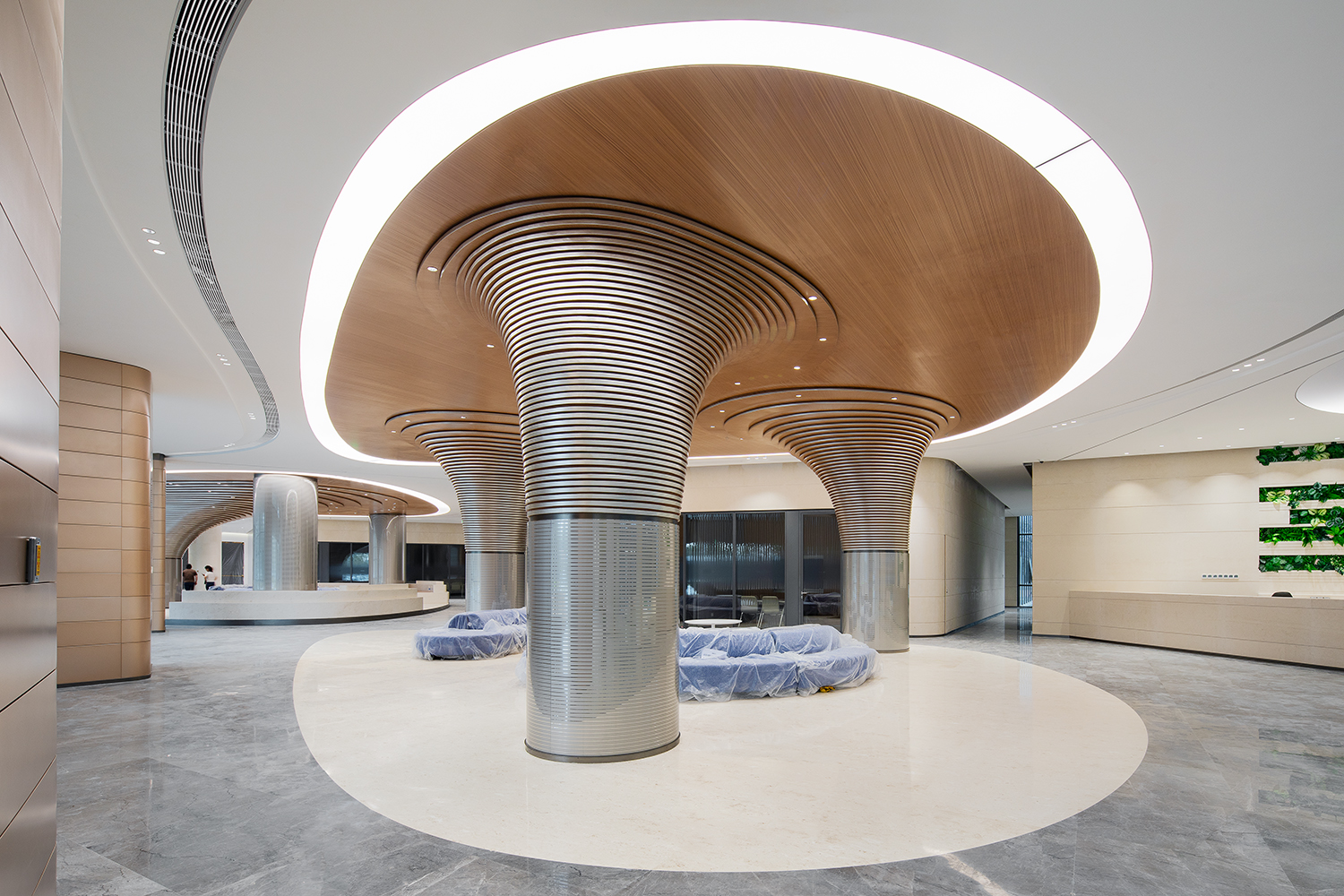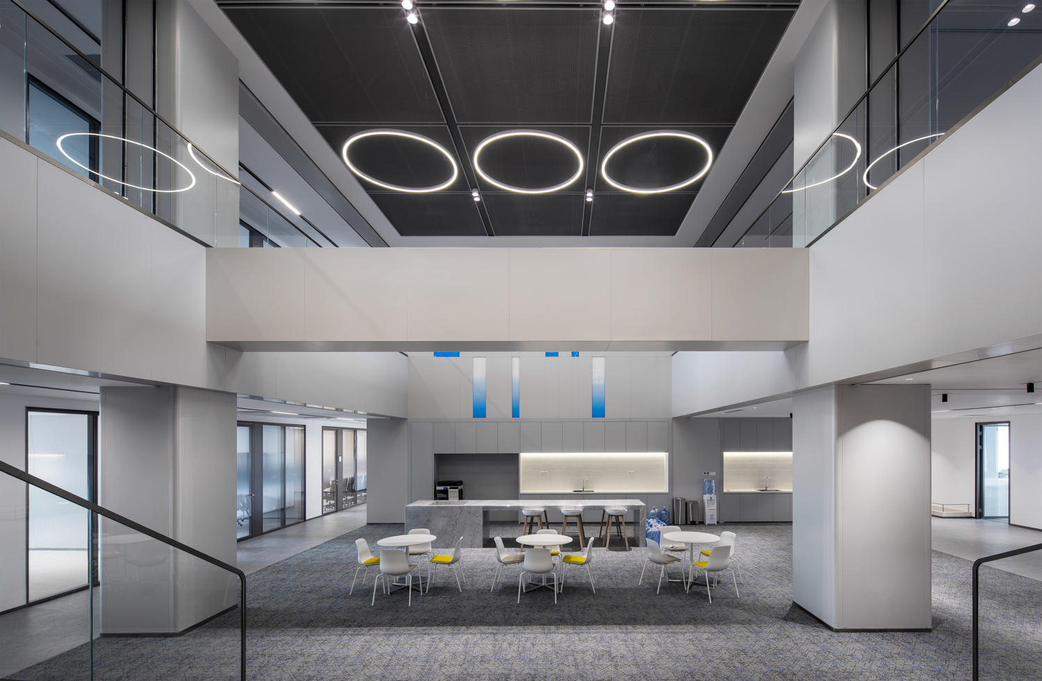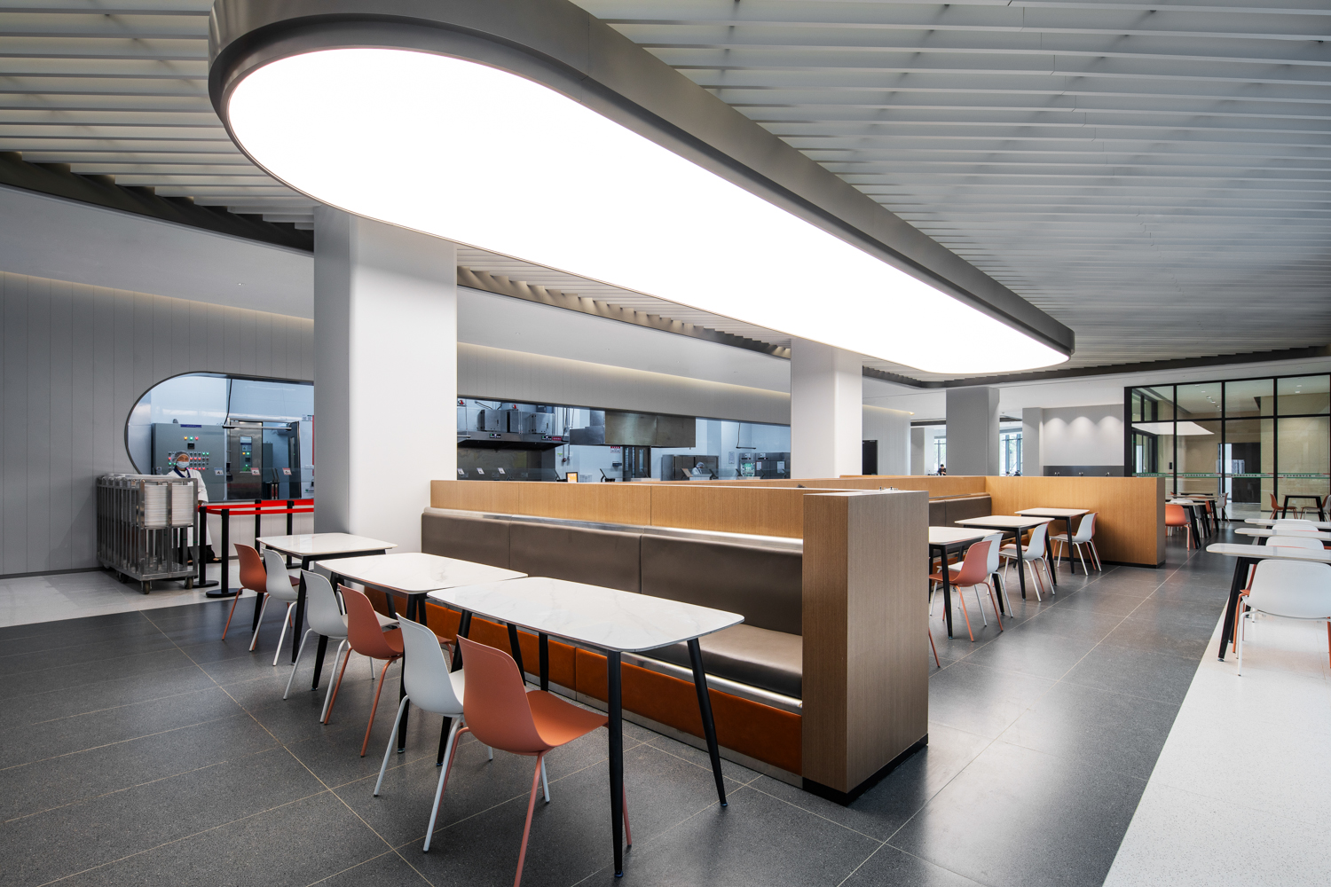 金螳螂承接了长飞先进武汉基地地下两层与地上七层的室内精装修工程,总施工面积达30000m²,涵盖共享办公区、访客大厅、会议空间、餐厅及公共区域等。在这里,设计美学与文化内涵深度融合,成为了科技与人文交织的创新典范。