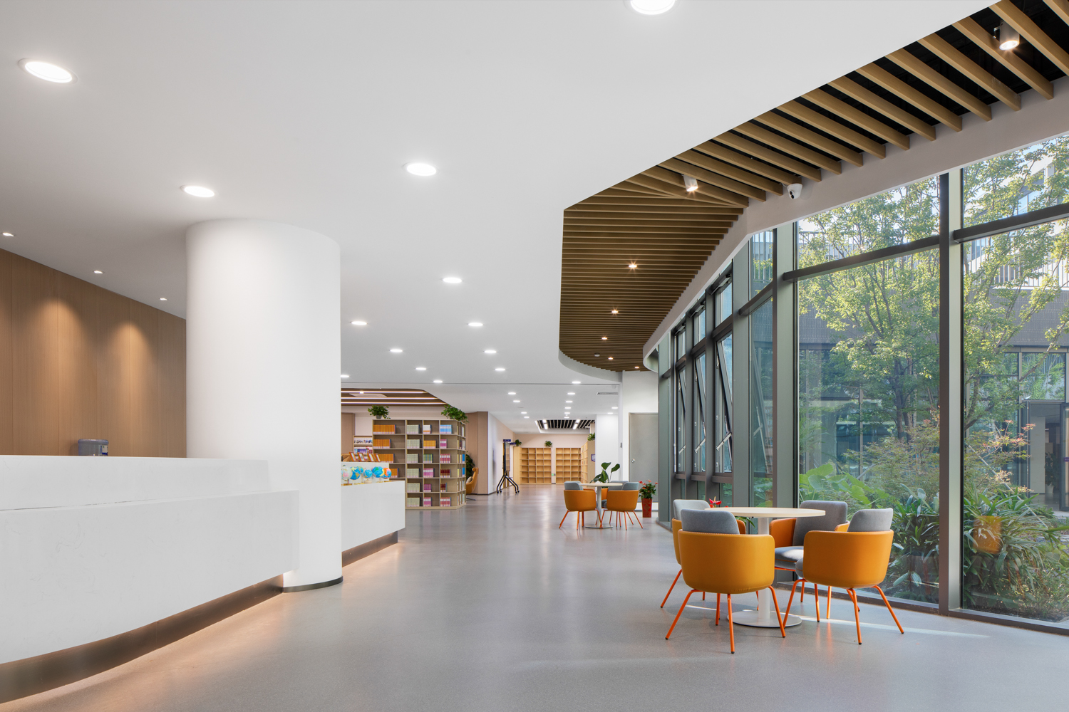 走进校园,仿佛走入苏州园林,“移步换景”手法给整体氛围带来灵活的变化,木纹格栅、浅灰调涂料、仿石材质等材质的运用,自然散发出温润、雅致的江南韵味。